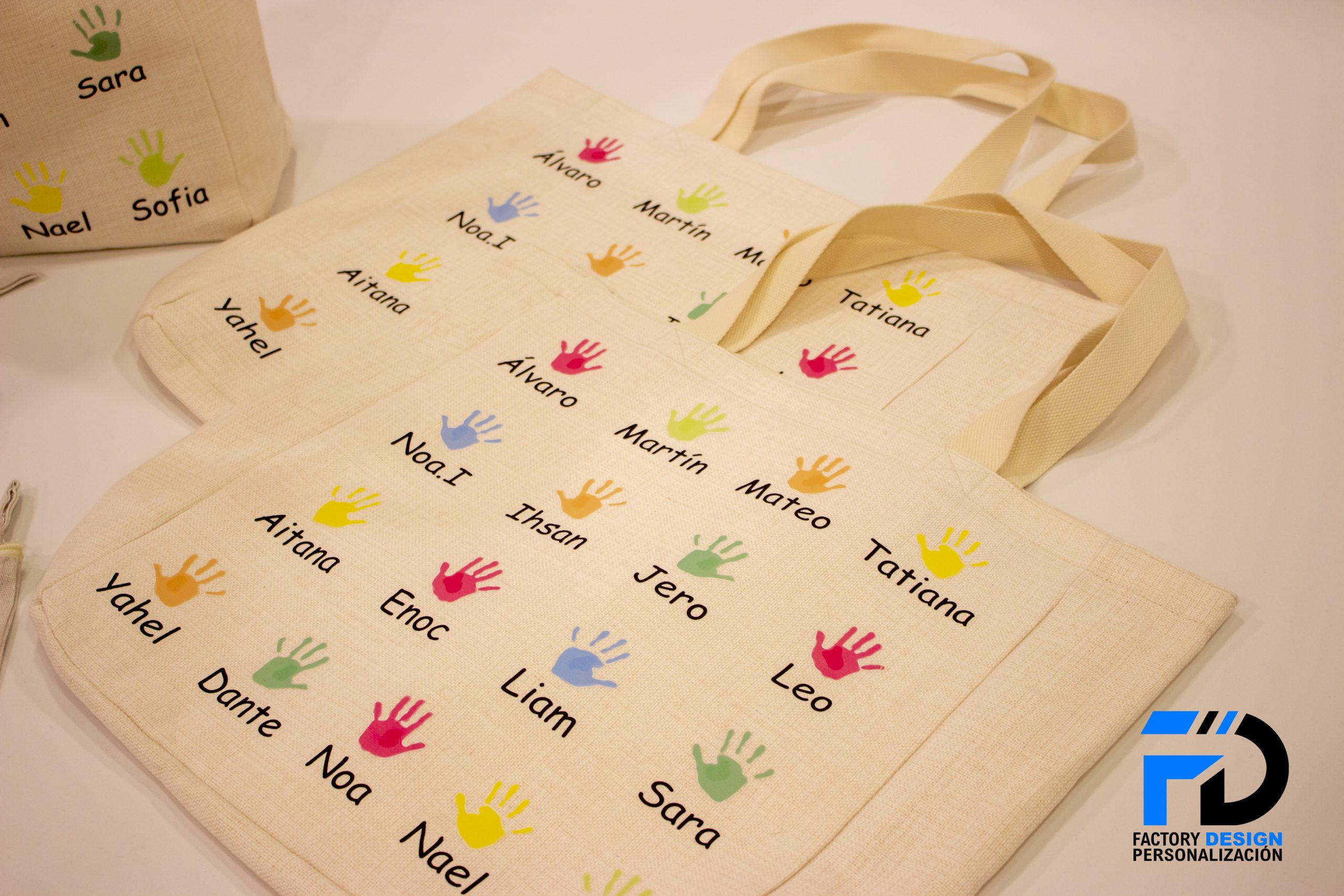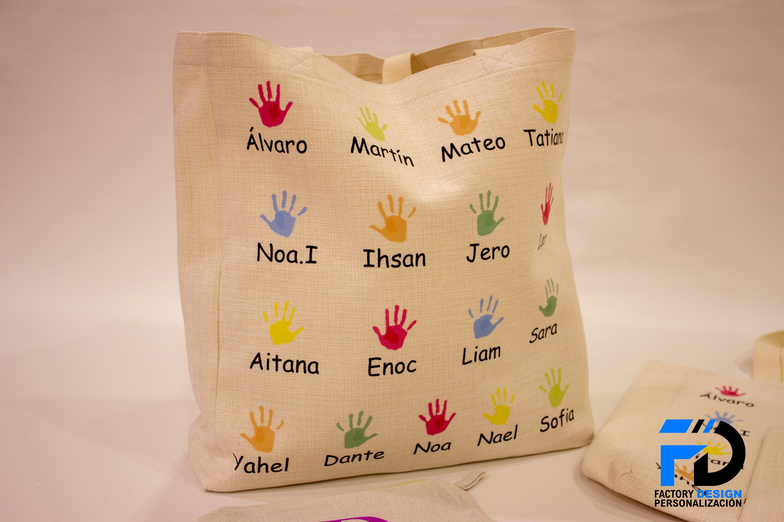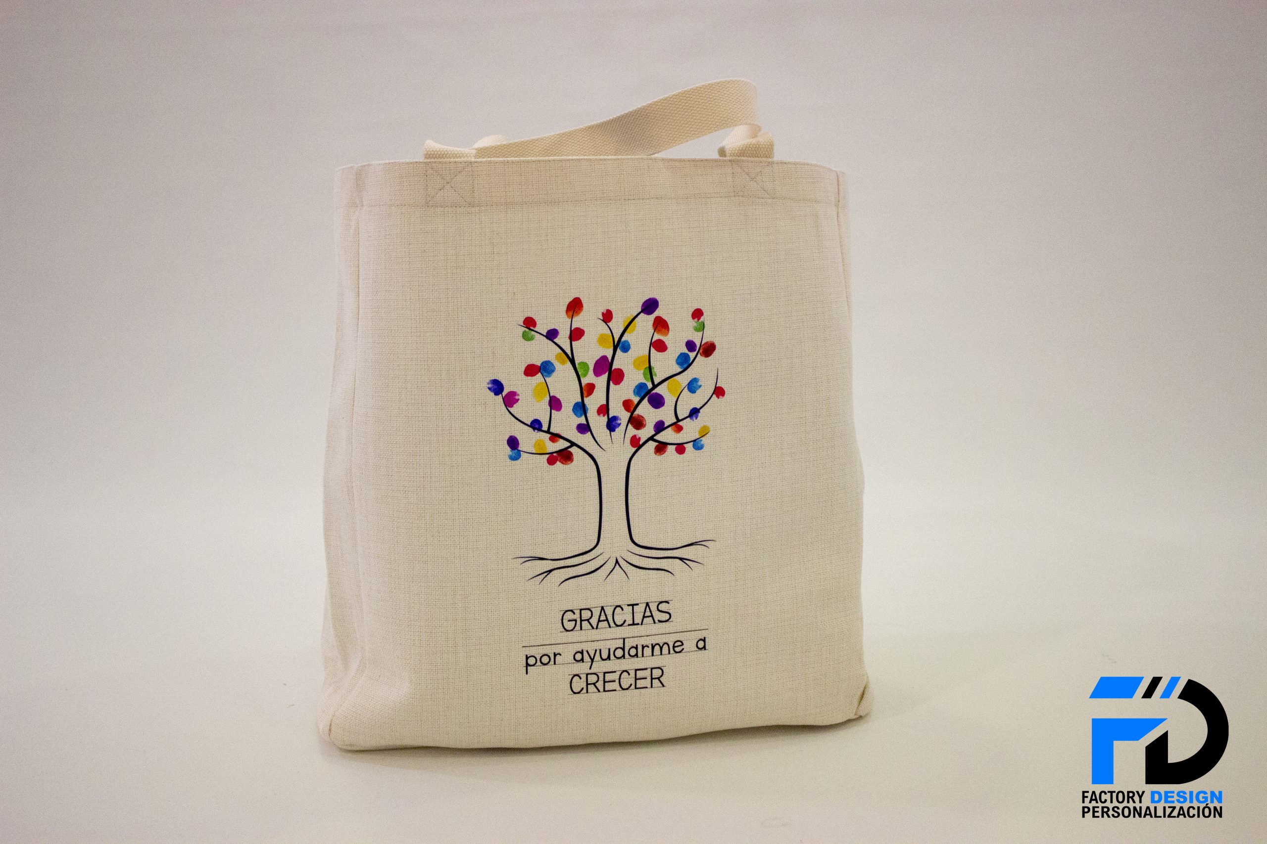 Bolsa 100% poliéster tipo lino en tono natural personalizada con el nombre de la profesora.