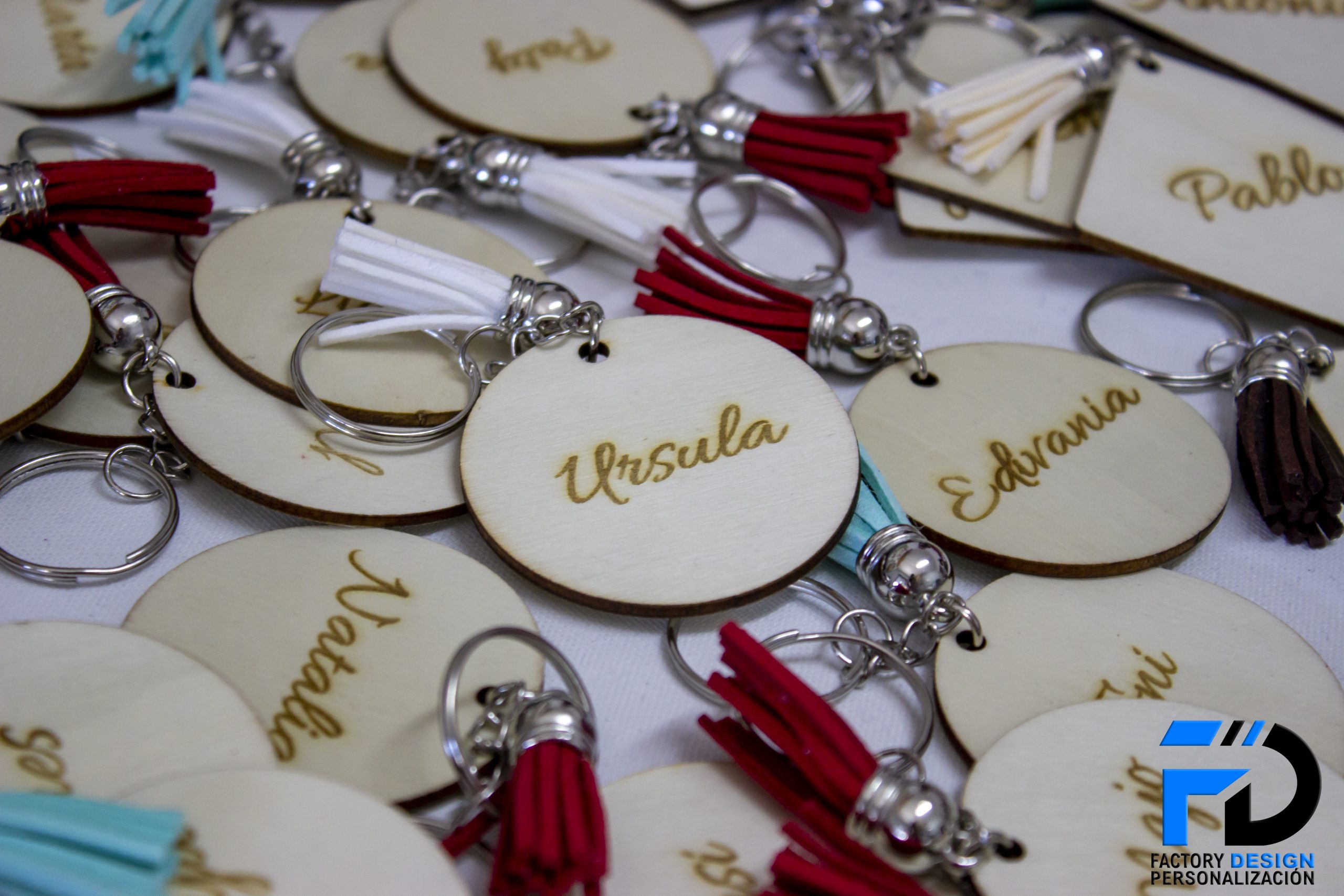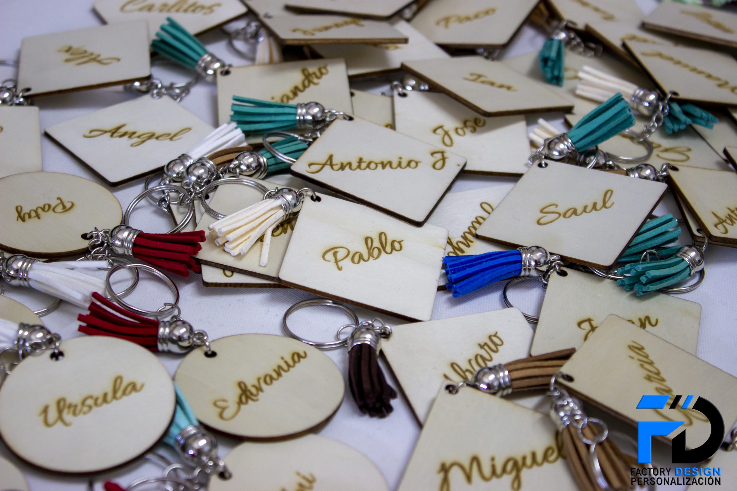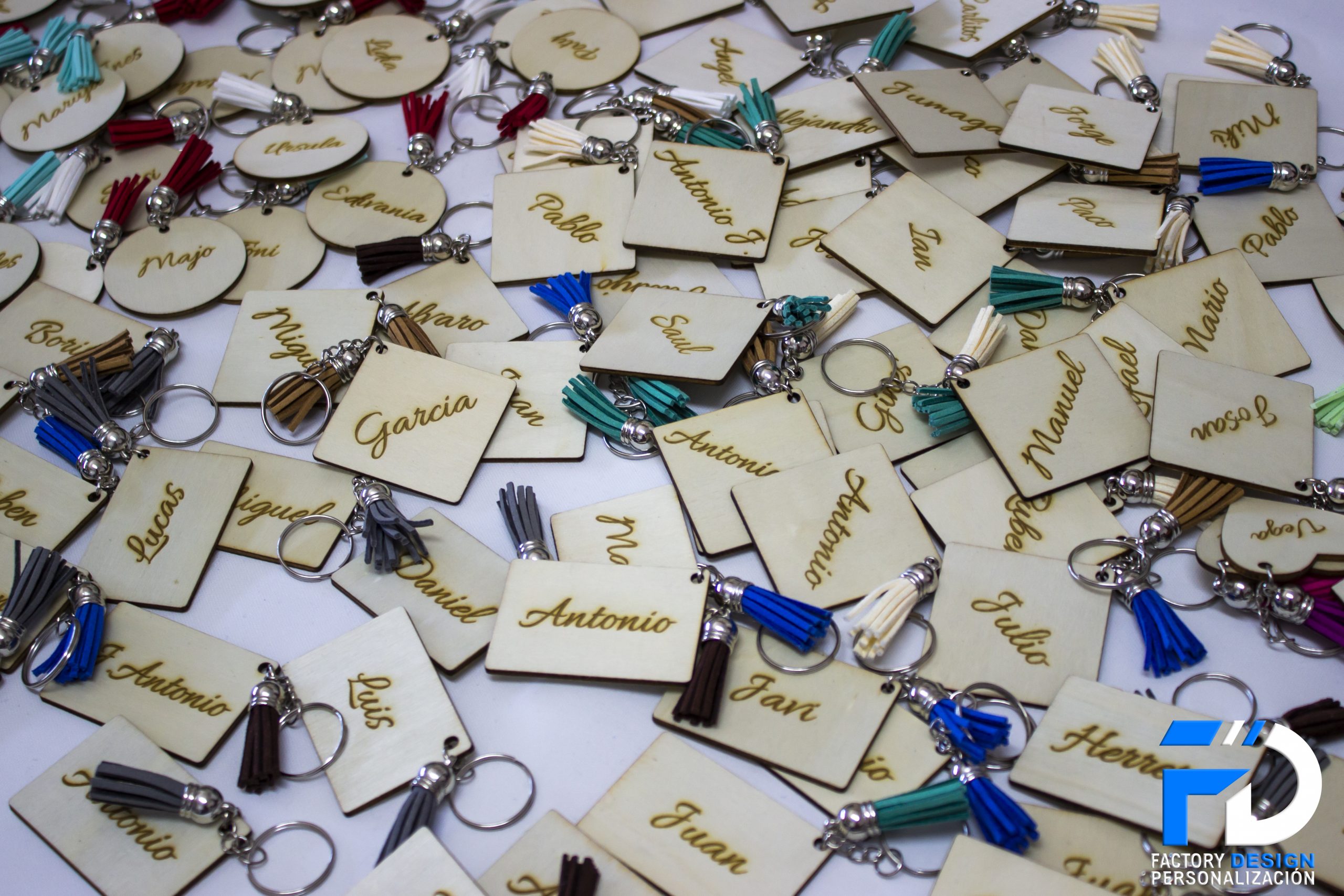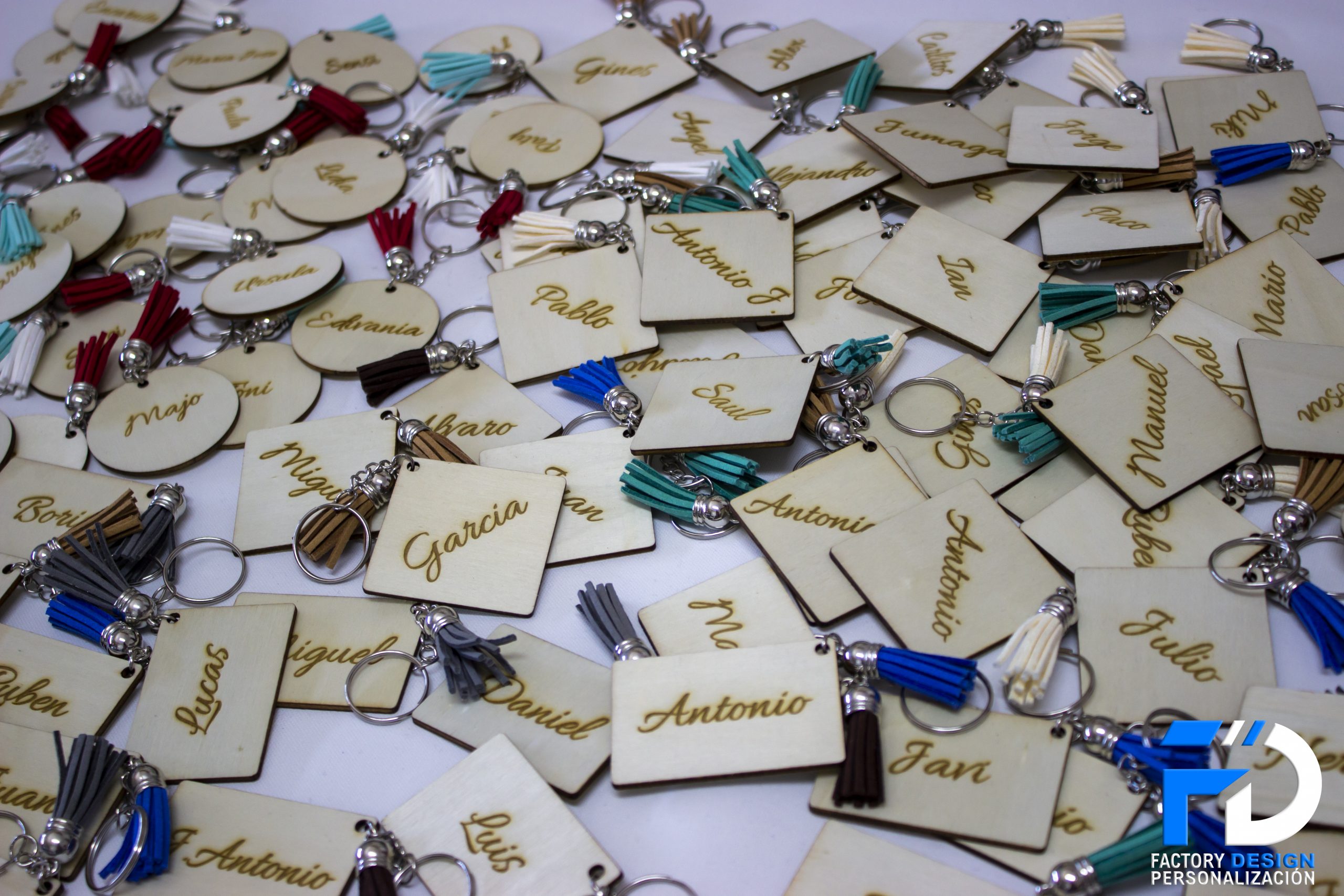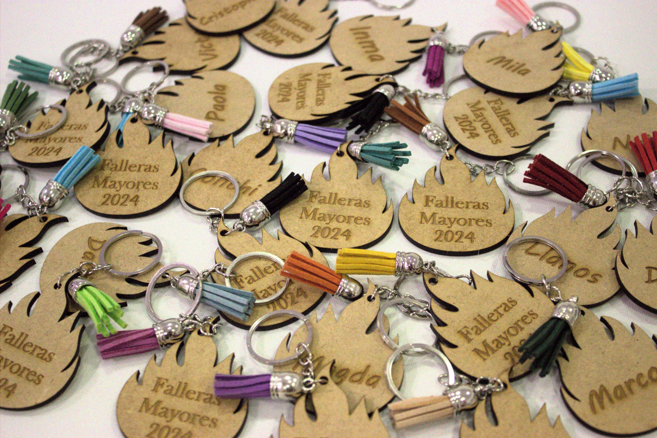 Llaveros realizados en madera con la forma que más te guste y el grabado con el nombre o frase que más te guste.
