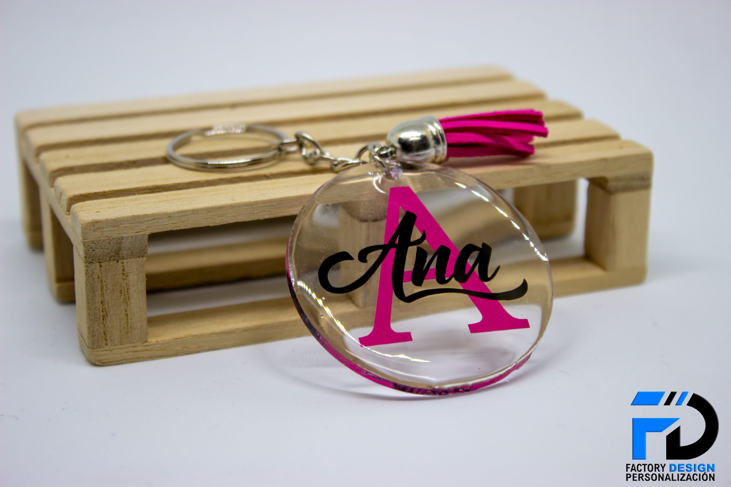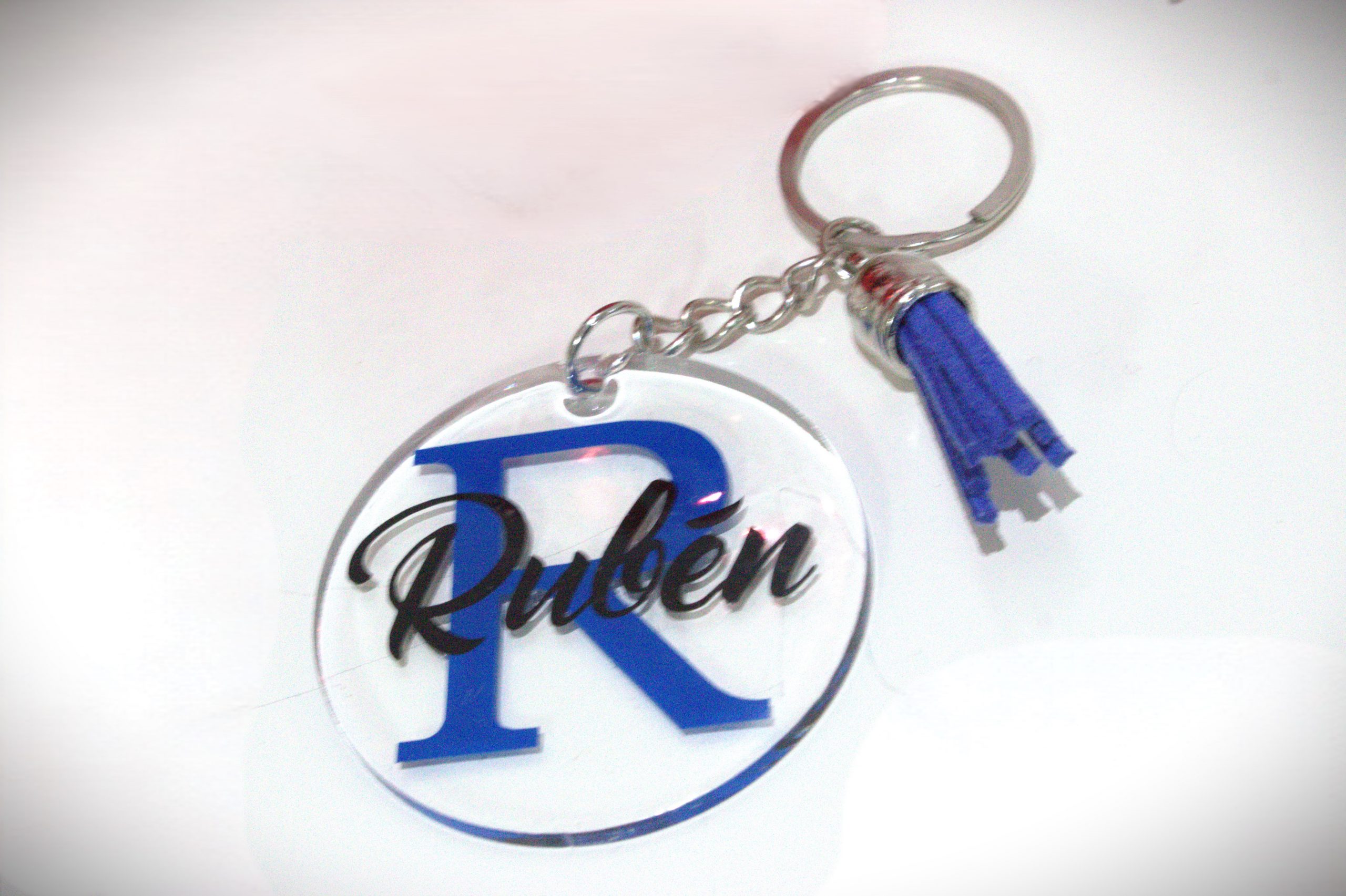 Marcasitios o Llaveros de metacrilato con inicial + nombre.