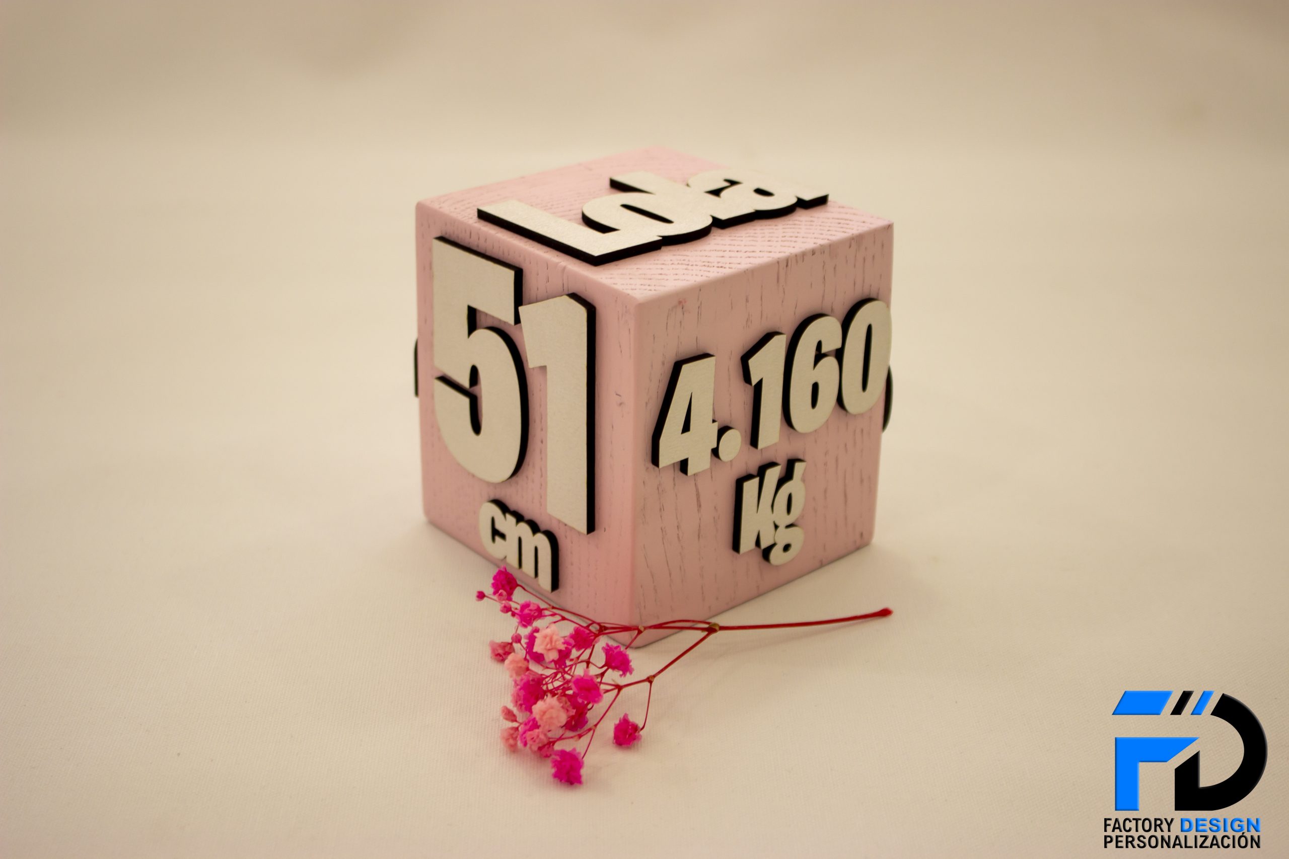 Preciosos cubos natalicio decorativos en color, ideales para regalar a unos estrenados papás o para decorar en la habitación y recordar los datos de su nacimiento.