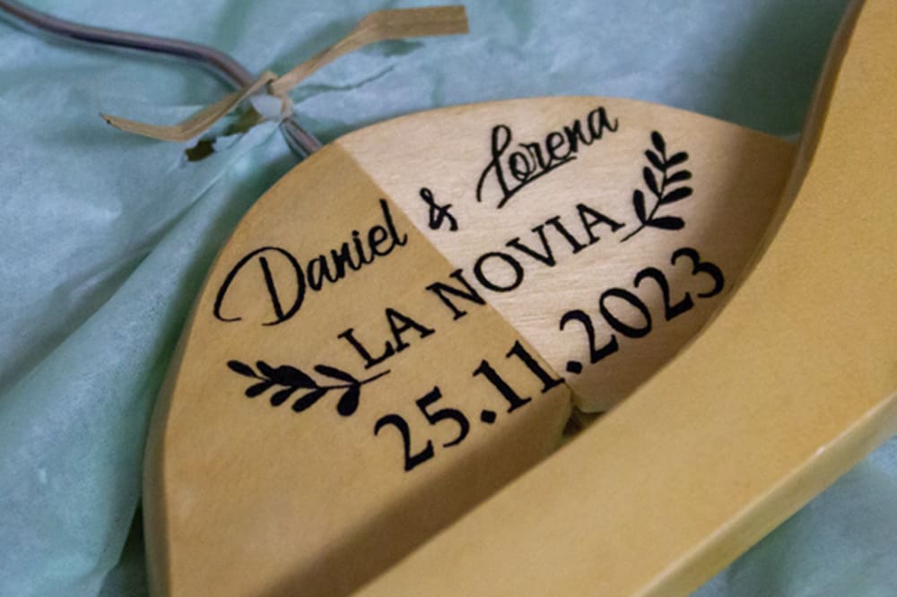 Percha de madera personalizada con los nombres de los novios y la fecha del enlace, grabados con láser.